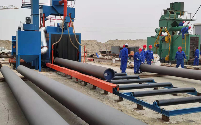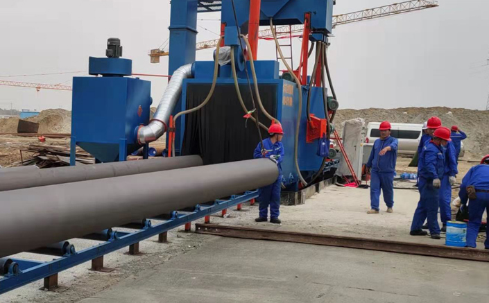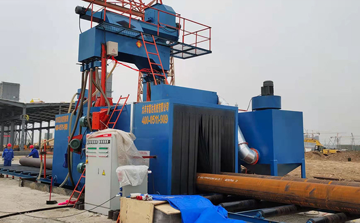 該鋼管外壁通過(guò)式拋丸機(jī)適用于直徑16~600mm范圍內(nèi)的鋼管外壁處理,采用與鋼管中心線成一定角度的“V”型輥輸送,從而實(shí)現(xiàn)鋼管邊前進(jìn)、邊旋轉(zhuǎn)。托輪間距可調(diào),實(shí)現(xiàn)了鋼管直徑范圍較大、行走速度與旋轉(zhuǎn)速度可調(diào):拋丸器采用底拋式布置,清理效率高,效果好。