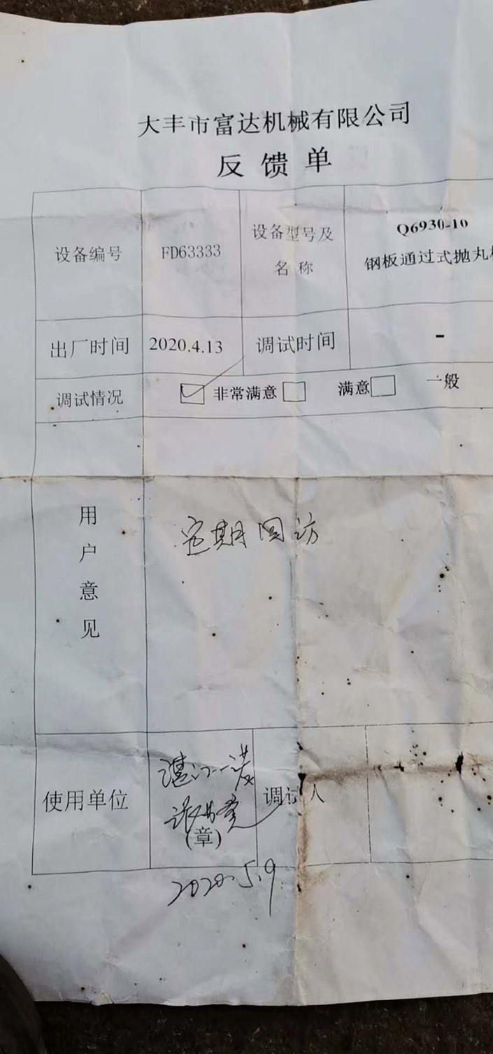 湛江客戶在富達(dá)機械訂購的Q6930-10鋼板通過式拋丸機結(jié)果一個多月的使用后,在我們的定期回訪服務(wù)中心,Q6930-10鋼板通過式拋丸機質(zhì)量得到了客戶非常滿意的認(rèn)可。這對富達(dá)機械而言,是一種激勵,更是一種鞭策。